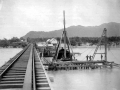A temporary trestle was constructed some 27 ft. downstream of the final structure to allow construction to proceed north while the final bridges were built. Work on this trestle started upon ice breakup on May 28, 1908, and was completed on July 4, 1908.